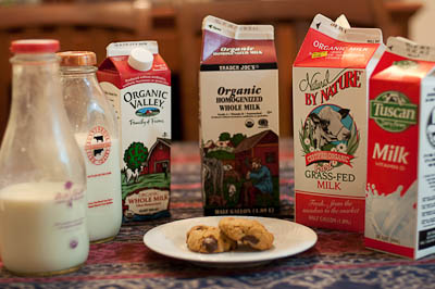 I invited a few friends over for an informal, unofficial, thoroughly unscientific, blind tasting of six different brands of whole milk readily available at shops and farmers’ markets near me. I thought it was important to do a blind tasting because studies have shown that knowing what you’re drinking affects the outcome. We are psychologically wired to believe that more expensive things taste better. One person (it wasn’t me) stayed in the kitchen with the milk containers and brought out samples in nondescript cups labeled with letters of the alphabet. The non-homogenized milks were shaken before pouring. We didn’t discuss our thoughts during the tasting to avoid influencing each other’s opinions. The identities of the milks were not unveiled until we had completed the tasting, at which time, we dug into a plate of freshly baked chocolate chip cookies.