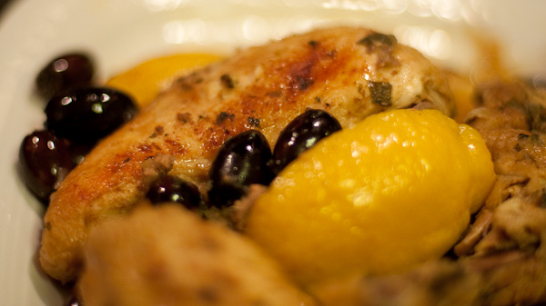 Oh, to be in the souk bargaining with an olive merchant, while chickens destined for the pot scurry around your feet. I’ve never been to Morocco, but if the mysterious flavors of its cuisine are any indication, I must visit. One of the classic combinations is a tagine of chicken with lemon and olives.